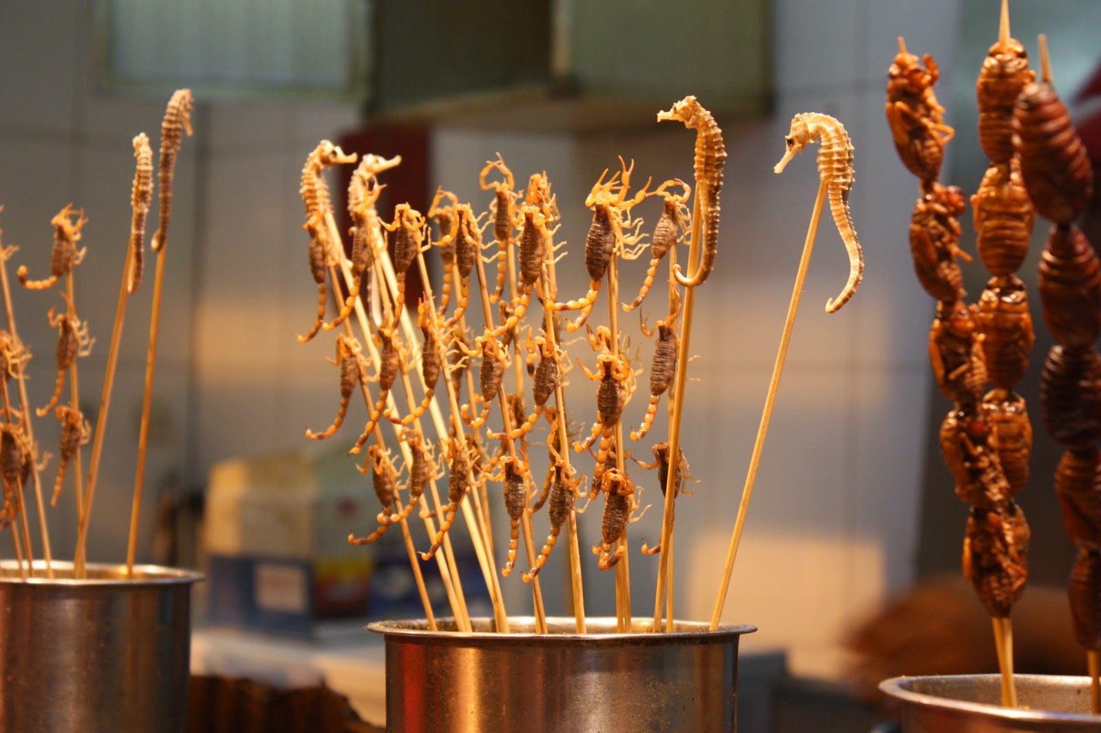 Hmyz je taktiež pomerne často na jedálničkoch. Fritované škorpióny, morské koníky, hviezdice, dokonca aj šváby. Na diskotéke vás môže chalan ponúknuť niečím v sáčku, z čoho sa nakoniec vykľujú opekané mravce. Z osobnej skúsenosti môžem povedať, že nejde o nič strašné. Chutí to normálne ako naše mäso. Znova je to len o psychike.