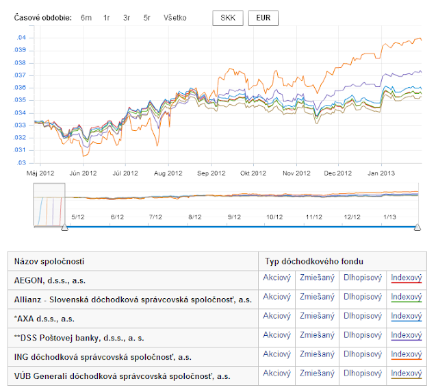 | Vývoj aktuálnej hodnoty dôchodkovej jednotky v jednotlivých dôchodkových fondoch dôchodkových správcovských spoločností za posledných 7 mesiacov (zdroj: nbs) |